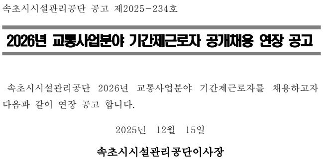 제목2026년 교통사업분야 기간제근로자 공개채용 연장 공고