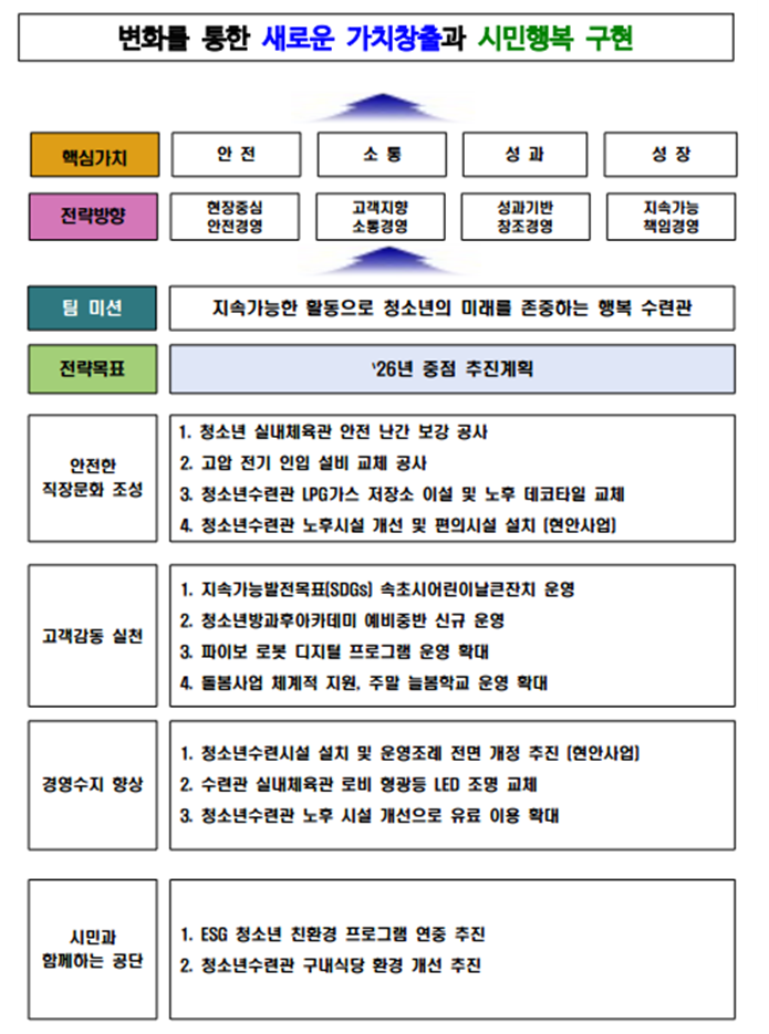 | 청소년 자치활동 | 청소년운영위원회 , 자원봉사단 , 기자단 , 미술동아리 | 1~12 월 |