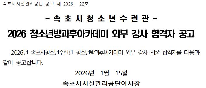 제목2026년 청소년방과후아카데미 외부 강사 합격자 공고