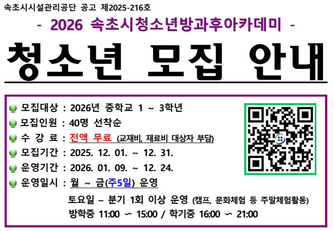 제목2026 속초시청소년방과후아카데미 청소년 모집안내