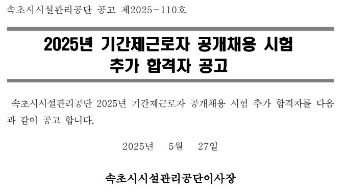 제목2025년 기간제근로자 공개채용 시험 추가 합격자 공고