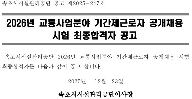 제목2026년 교통사업분야 기간제근로자 공개채용 시험 최종합격자 공고