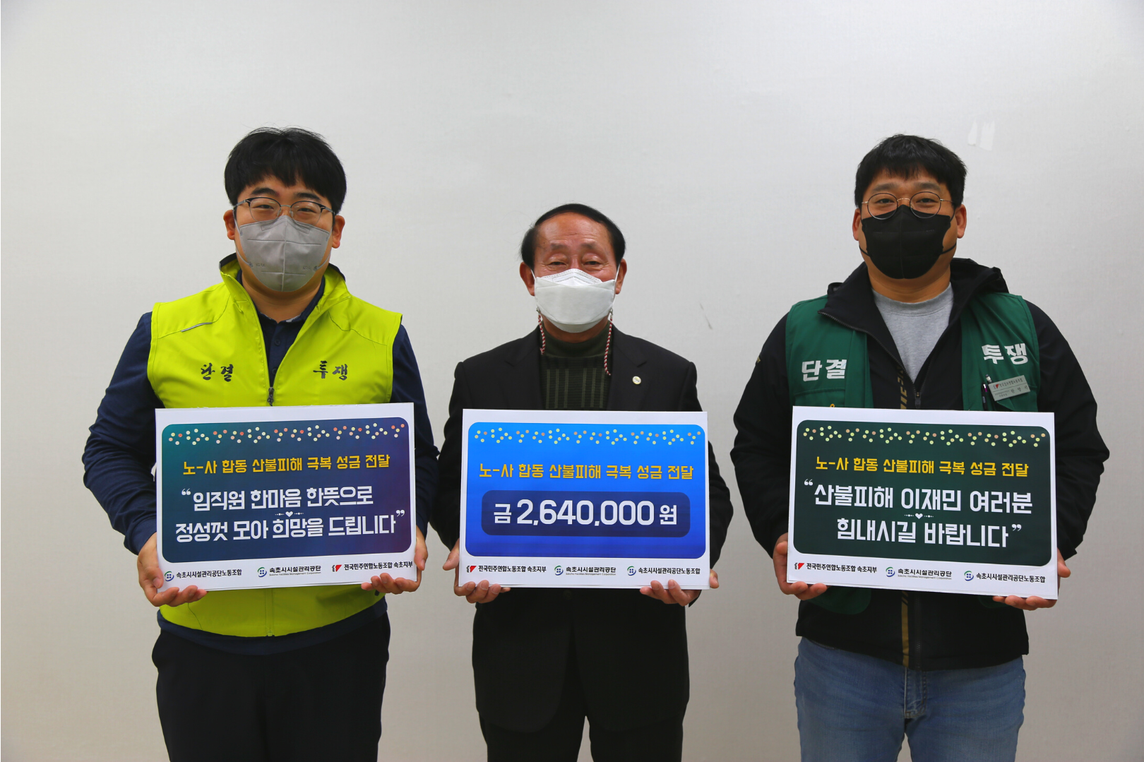 속초시시설관리공단(이사장 이병광)은 강원·경북지역에 동시다발적으로 발생한 동해안 산불로 피해를 입은 주민들을 위하여 임직원 일동 산불피해 성금 전달식을 21일 실시하였습니다. 노동조합 등 임직원 236명이 참여하여 총 금2,640,000원의 모금이 성금되었으며, 성금은 전국 시·군·구 지방공기업 협의회(전공협)를 통해 3월 22일 구호단체 사회복지공동모금회 앞으로 전달될 예정입니다. 공단은, 향후 산불 피해지역의 복구를 위하여 봉사활동을 병행 실시하며 어려움에 처한 이재민들을 적극 도울 예정입니다.